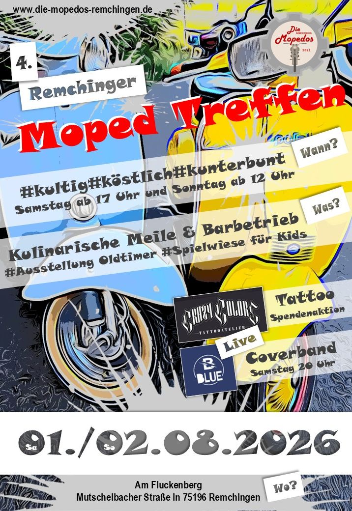 Geplant sind in diesem Jahr auch wieder Kult & Kulinarik am Fluckenberg: Wir laden herzlich zum 4. Remchinger Mopedtreffen am 01./02.08.2026 und zum Herbstfeschd am 10./11.10.2026 ein.