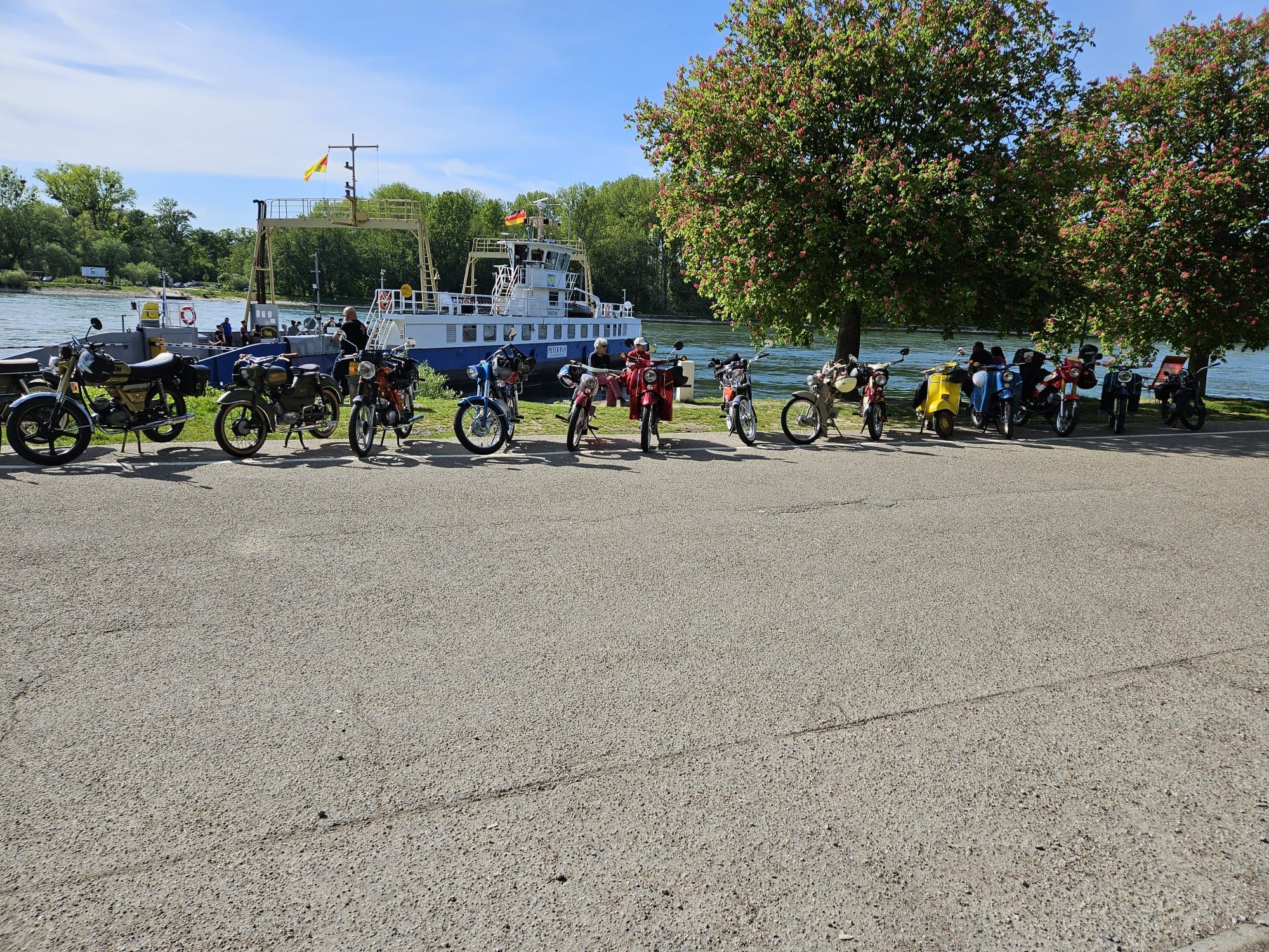 Mit doppelbesetzter Schwalbe wurde die Reise zur Fähre nach Leimersheim fortgesetzt. Der Wechsel auf die Wasserstraße mit Blick auf den glitzernden Rhein, gab die Möglichkeit für Entspannung der Gesäße und spannende Gespräche.