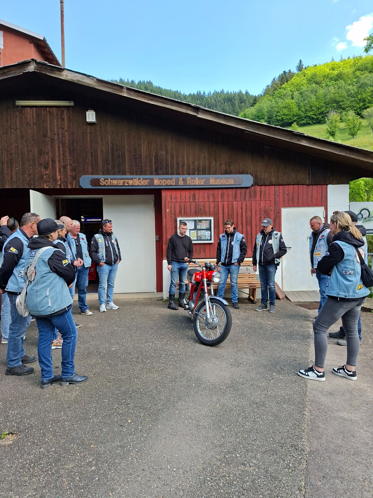 Der Auftakt begann mit dem imposanten Schauspiel einer Kolonne von 14 Mopeds und 2 Vespas, die sich elegant durch die Straßen von Kleinsteinbach und Stupferich schlängelten. Das sonore Brummen der Motoren war wie ein beschwingtes Musikstück. In Waldbronn verstummt das fröhliche Summen. Die himmelblaue Vespa verweigerte jegliche Tonalität und fand Unterschlupf in befreundeter Garage.