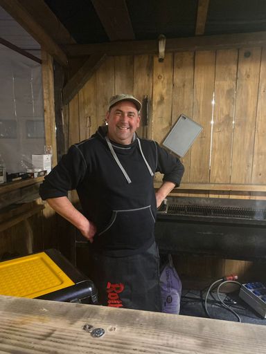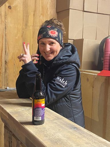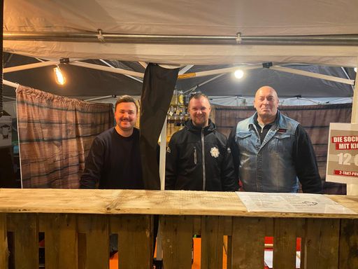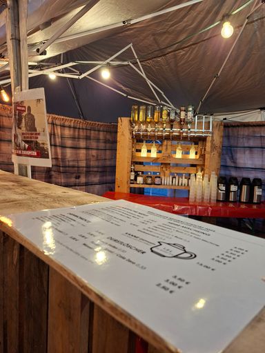 Lichterketten sorgten für visuelle Buntheit über den markanten Holzständen von Getränketheke und Kulinarischer Meile und die kunstvolle Schreibweise auf den Tafeln visualisierte das schmackhafte Angebot, von Winzersteak über Flammkuchen und 2-Takt-Mischung. Das Gastro-Team hatte bereits morgens das Feuer angeschürt und der Spießbraten drehte gelassen seine Runden, während das Kreativ-Team das Zelt in eine behagliche Hüttenatmosphäre hüllte. Die Außentemperatur zeigte „Zeit für Warmgetränke“ an und so wanderten dampfender Jagertee und Glühweinkännchen über den Tresen.