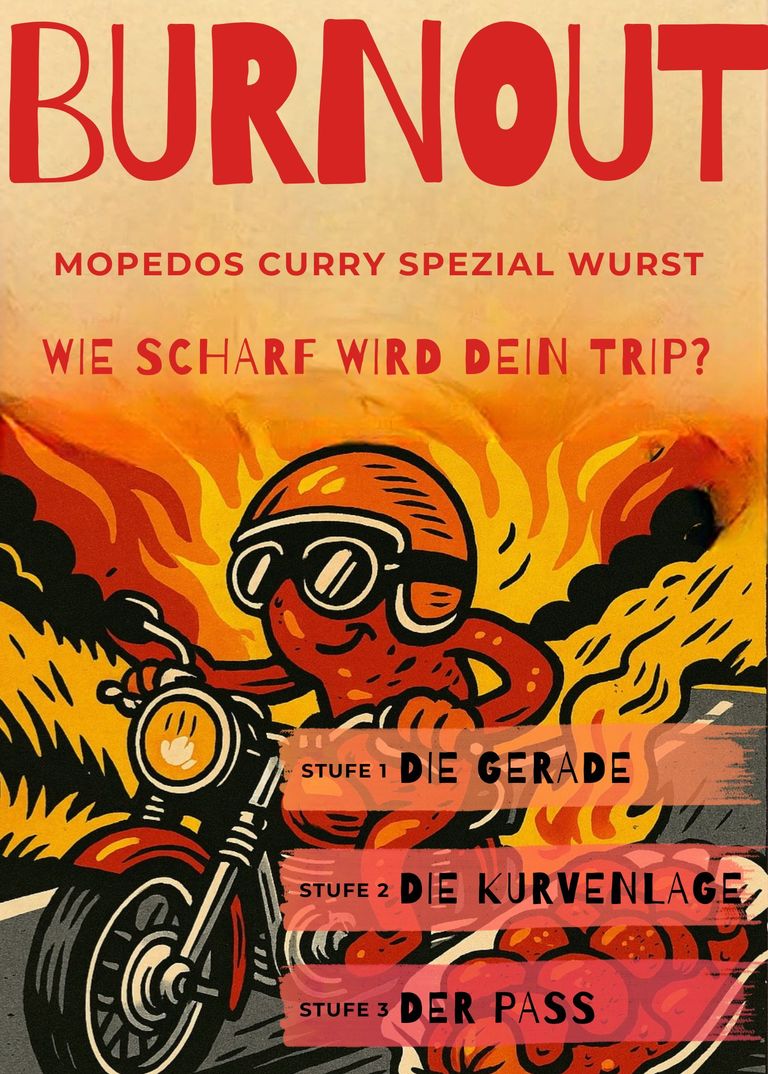 So war es ein ganz gewöhnlicher Sonntag, an dem sich eine Gruppe mutiger Feuerschlucker entschloss, das Unmögliche zu wagen: die „Mopedos Curry Spezial Wurst" zu testen. „BURNOUT“ ist keine normale Wurst. Sie wird mit einer Soße serviert, die aus einer besonderen Rezeptur und einem geheimen Tränenextrakt des Feuertiers besteht. Eine Gruppe, bestehend aus 10 Helden, trat mit Handschuhen und einem Erste-Hilfe-Koffer an. Einer hatte sogar seinen Mopedhelm auf. „Sicherheit geht vor“, sagte er, kurz bevor ihm die Nase lief wie ein Wasserfall. „Ich sehe Farben, die es gar nicht gibt!“ hörte man einen anderen flüstern. Der Versuch, die Schärfe mit einem Liter Milch zu bekämpfen – endete in der Erkenntnis von Laktoseintoleranz. Ein anderer weinte. Ein bisschen jedenfalls. Nach 15 Würsten, 6 Liter Flüssigkeit und einem spontanen Gruppenkuscheln war es vollbracht: Die „Mopedos Curry Spezial Wurst“ war geboren. Ob die Geschichte sich im Detail so zugetragen hat, bleibt das Geheimnis der 10 Helden.