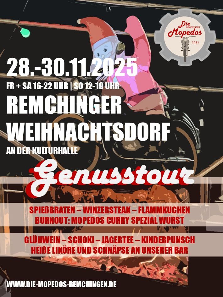 Das 1. Adventswochenende blinzelt aus dem Kalender und die Vorbereitungen für das Remchinger Weihnachtsdorf sind im vollen Gange. Die Mopedos-Bau-Crew hat wieder Vollgas gegeben: gehämmert, geschliffen und alles ordnungsgemäß für den Transport an die Kulturhalle verschnürt. Die Gastro-Crew hat die Etappen der Genusstour über Spießbraten, Winzersteak und Flammkuchen festgelegt. Aber der letzte Kick fehlt… der WUMMS.